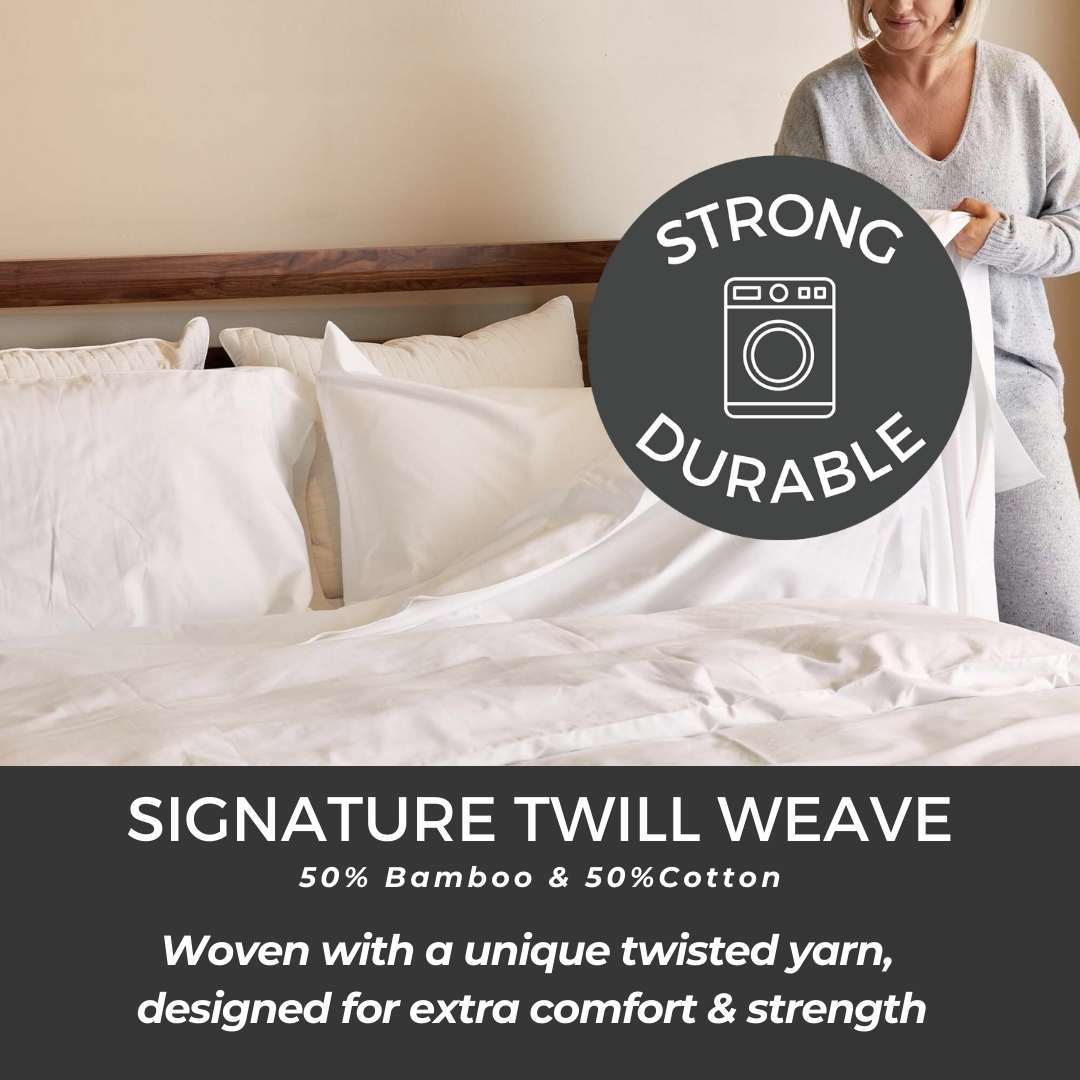 Ready to upgrade from basic cotton? Our Melange Bamboo Sheets blend the silky softness of bamboo with the durability of long-staple cotton, giving you the best of both worlds. This sheet set is breathable, naturally temperature-regulating, and smoother than traditional bedding, designed to keep you cool, dry, and incredibly comfortable all night long. This perfect pairing is ideal for those new to bamboo or looking for a little extra structure in their bed sheet. With our signature tight twill weave, these bedding sets resist pilling and stand up beautifully to everyday use. Hypoallergenic and gentle on sensitive skin, they’re a smart step toward better sleep and a healthier home. Melange is bleachable and BPO-safe.