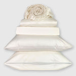 Set includes: 1 Fitted, 1 Flat and 2 Pillowcases packaged inside a reusable storage bag made from repurposed scrap bamboo fabrics.