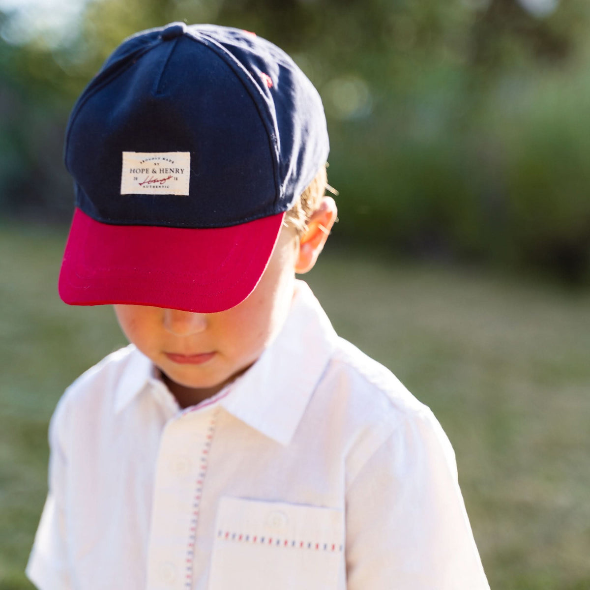 • Contrast bill and adjustable back slide closure. Small canvas logo label.