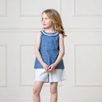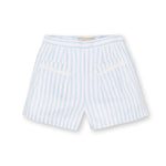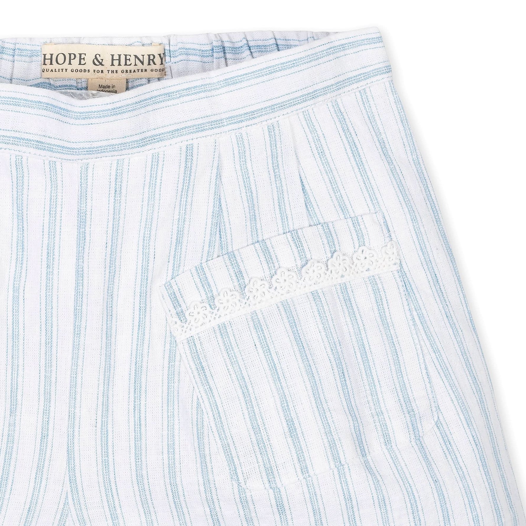 Our easy breezy flat front short in a soft organic cotton linen blend will keep your girl comfortable all spring and summer long. Features front patch pockets with special crochet trim and elastic at the back waist for easy on and off. Fully lined in organic cotton. Pairs beautifully with our woven tops!