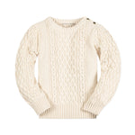 Our feminine take on the classic fisherman sweater features gold button details at the shoulder as well as gently ballooned sleeves. A beautifully chunky cable knit in soft organic cotton adorns the front, back, and sleeves for a look that will keep her warm all season long. Pairs perfectly with our collection of organic cotton skirts and leggings.