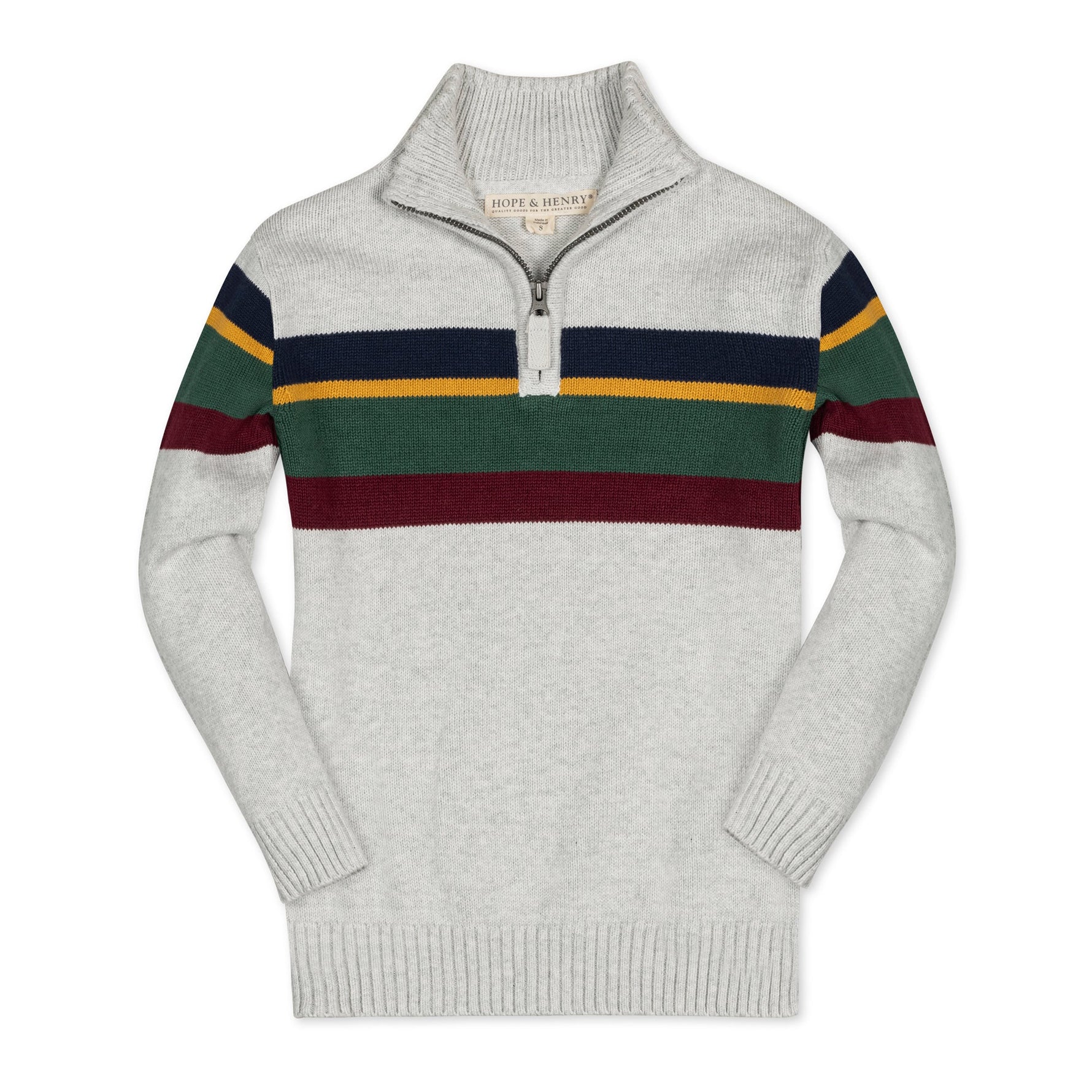 Our soft sweater will be a layering wardrobe staple for your stylish guy. Features a sporty, fall-forward engineered stripe. A ribbed mock neck and front half zip make for easy-on and easy-off, all in our signature super cozy 100% organic cotton yarn. Layer over one of our button downs for a complete look!