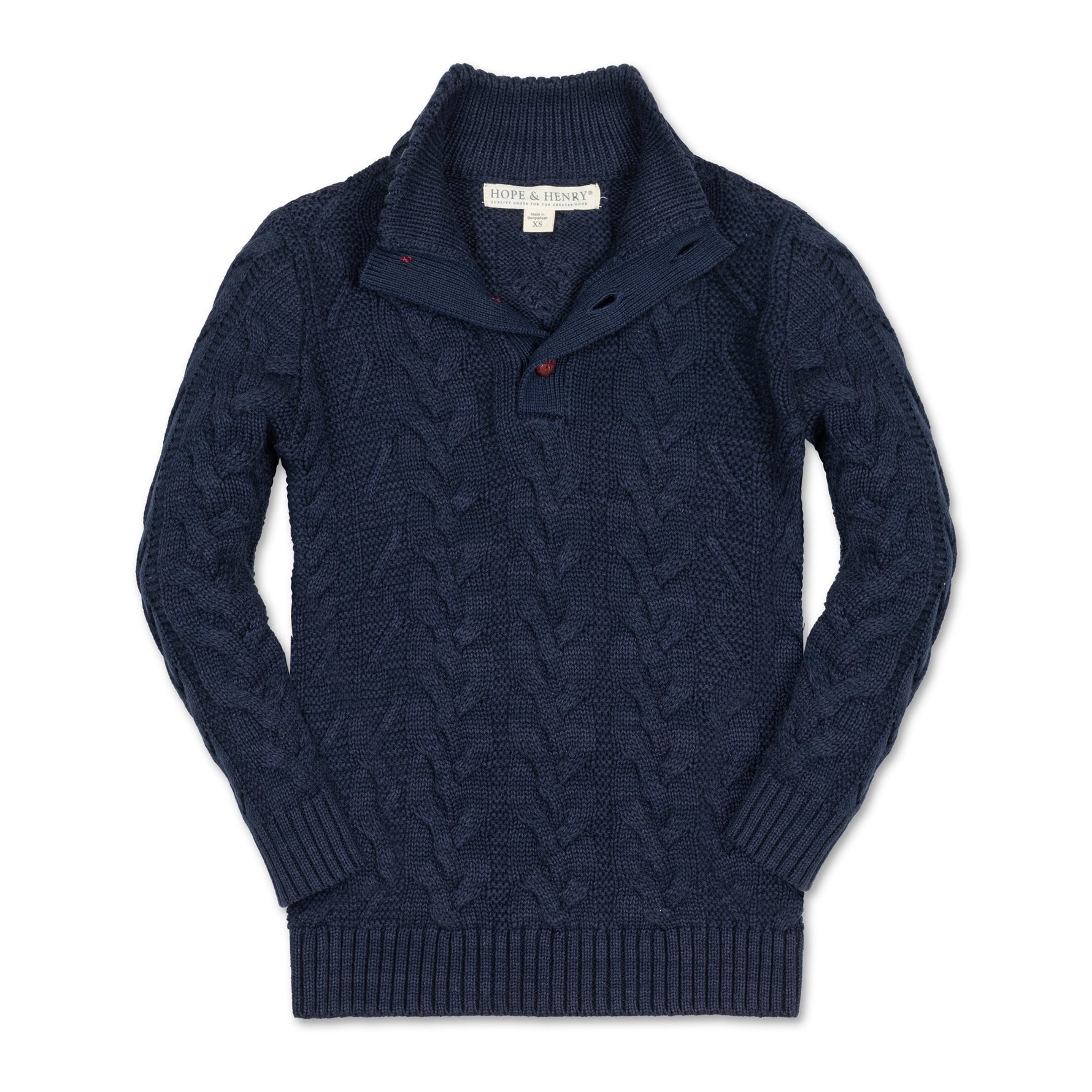 Luxuriously plush cables in our signature organic cotton yarns make this sweater a must have for cooler months. Features a rib knit mock neck with faux leather button closures at the center front placket. Fully adorned with a classic cable knit. Pairs perfectly with our collection of organic cotton button downs and pants.