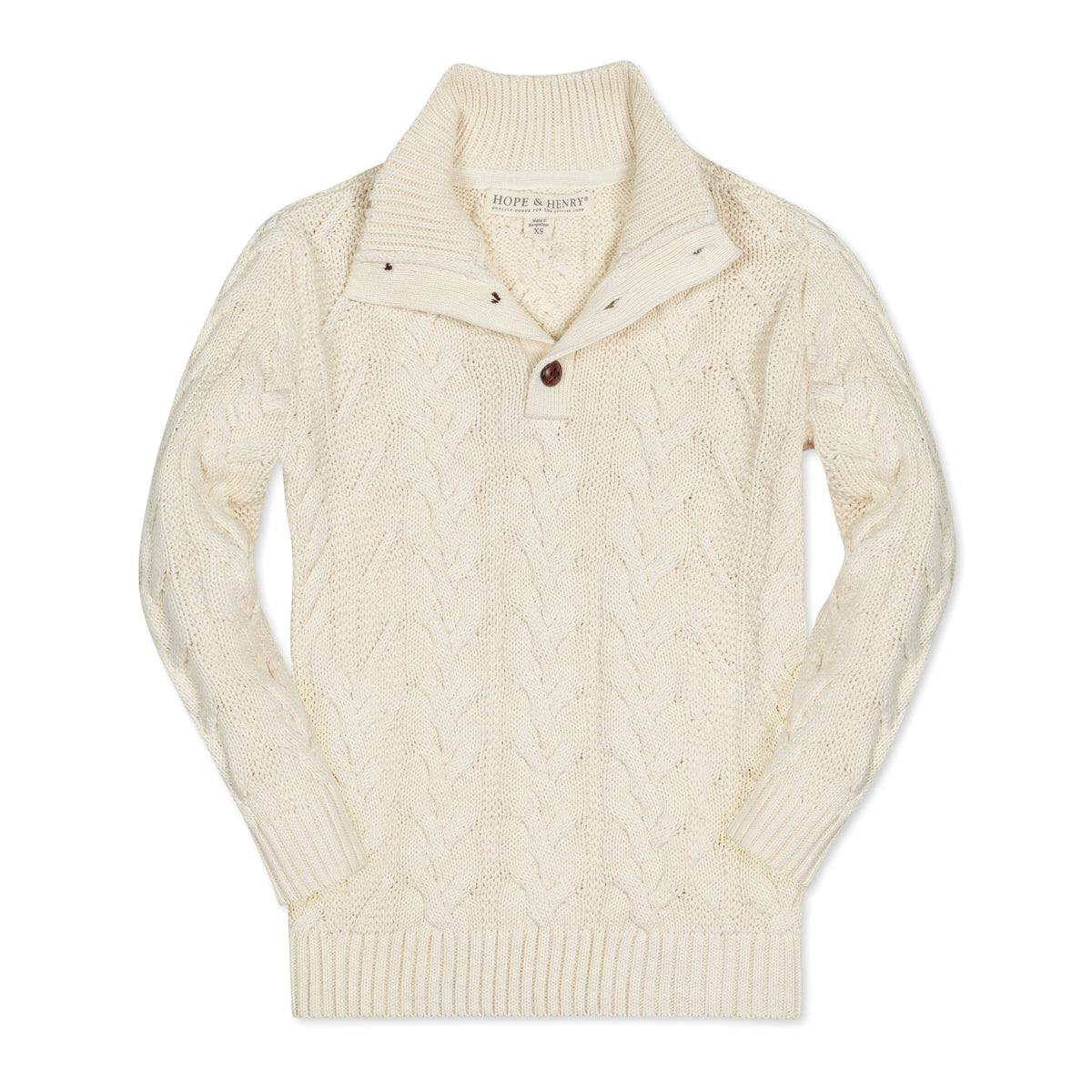Luxuriously plush cables in our signature organic cotton yarns make this sweater a must have for cooler months. Features a rib knit mock neck with faux leather button closures at the center front placket. Fully adorned with a classic cable knit. Pairs perfectly with our collection of organic cotton button downs and pants.