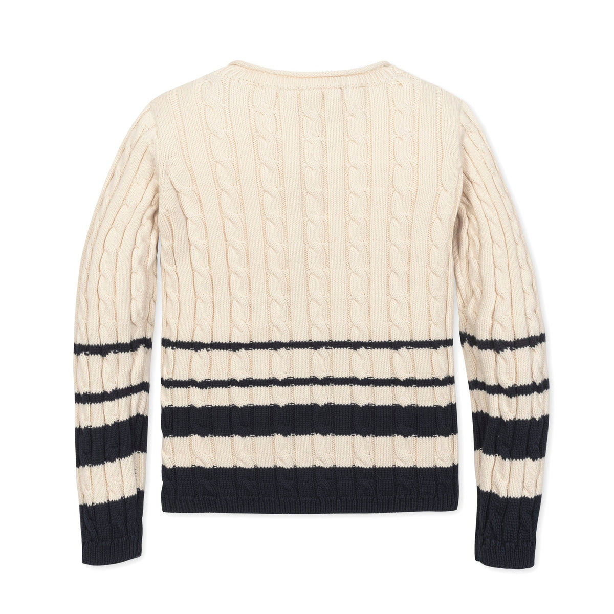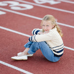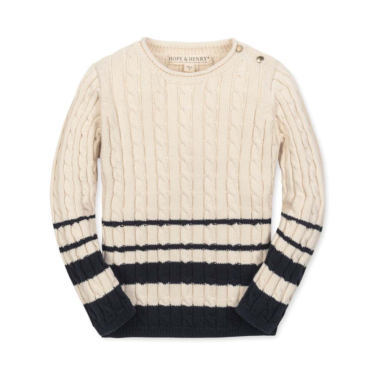 Your girl will be back to school style personified in our beautiful cable knit sweater crafted from soft organic cotton. Features a delicate allover cable knit paired with stripe details at the cuffs and hem. Gold buttons at the shoulder add a bit of shine. Pairs perfectly with our collection of organic cotton tops, skirts, and leggings.