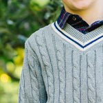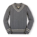 Stay sharp in our preppy cable knit cricket sweater in plush organic cotton. Beautiful cable knit adorns the entire sweater and is trimmed in contrasting stripes at the neck, sleeves and hem. Layers great over our collection of button downs - this is a sweater he'll treasure and pass down for years to come.