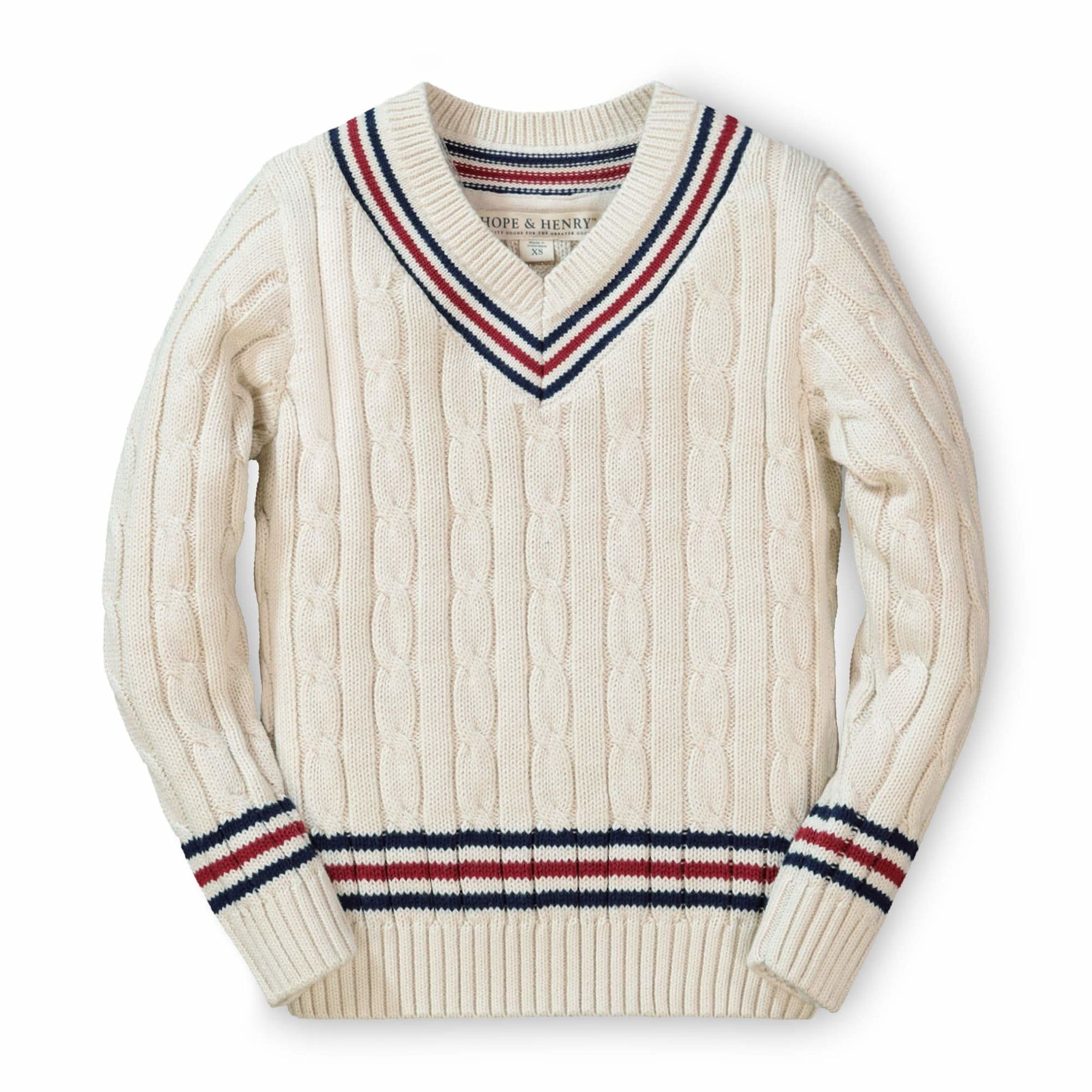 Stay sharp in our preppy cable knit cricket sweater in plush 100% organic cotton. Beautiful cable knit adorns the entire sweater and is trimmed in stripes at the neck, sleeves and hem. This is a sweater to treasure and pass down for years to come.
