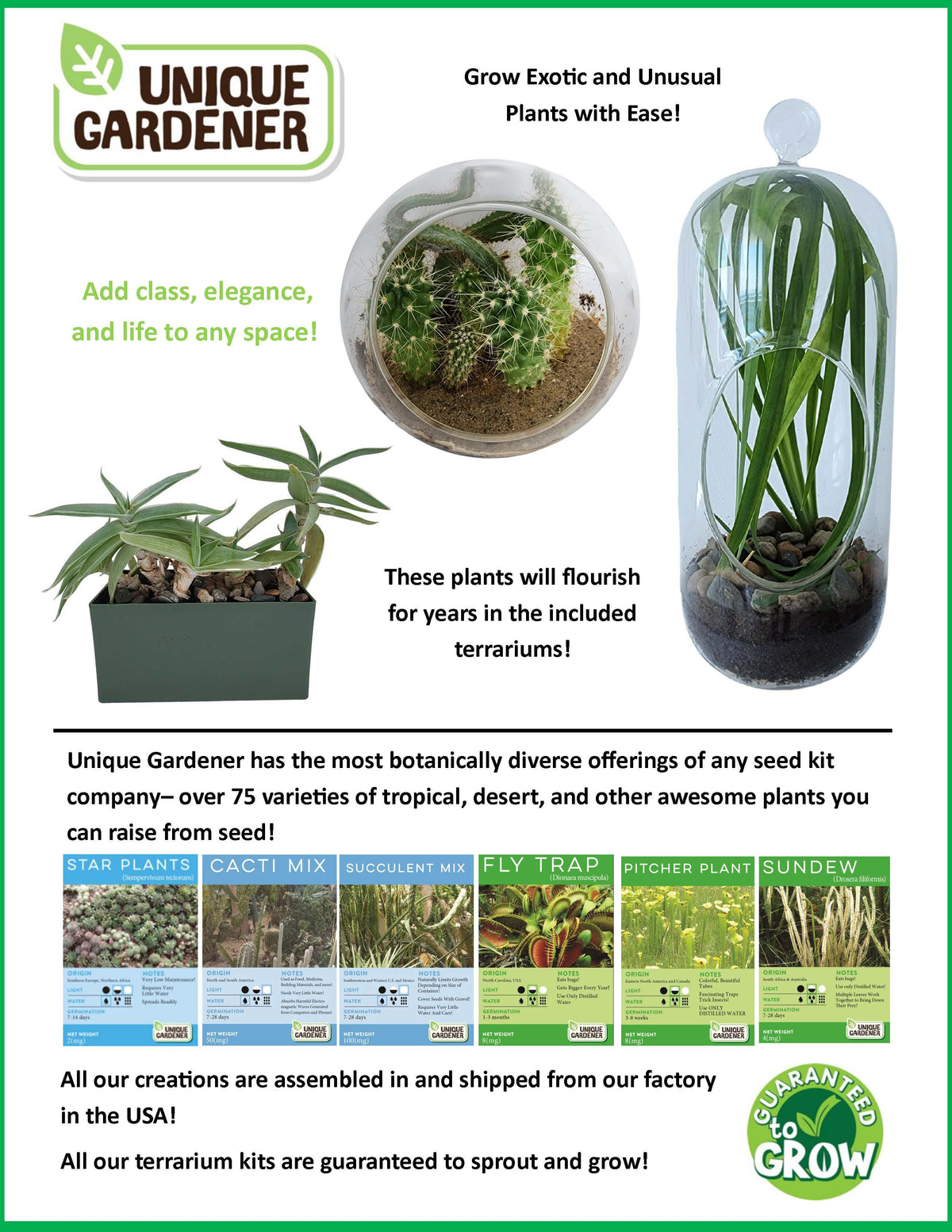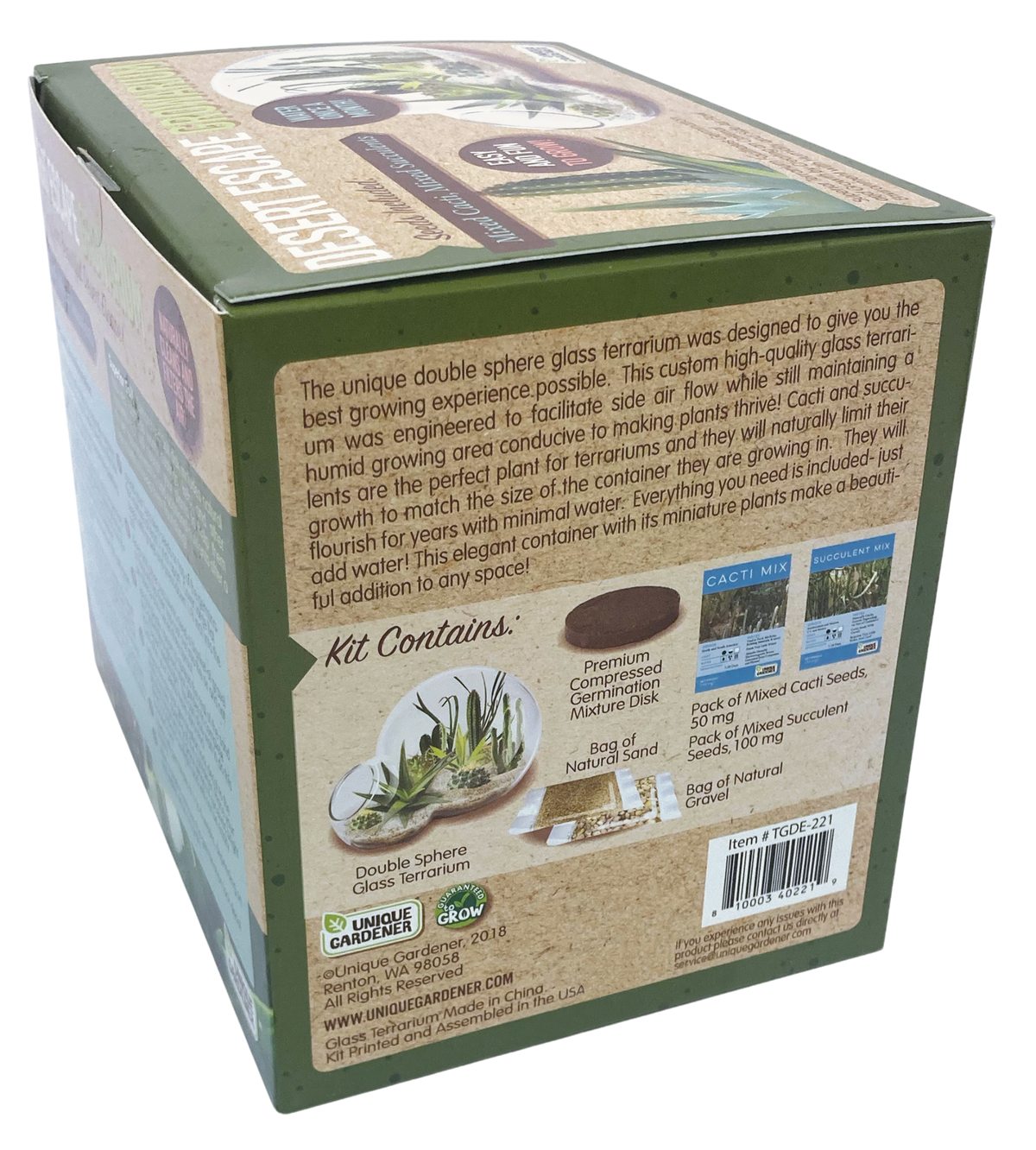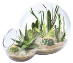 The unique double sphere glass terrarium was designed to give you the best growing experience possible.  This custom high-quality glass terrarium was engineered to facilitate side air flow while still maintaining a humid growing area conducive to making plants thrive! Cacti and succulents are the perfect plant for terrariums and they will naturally limit their growth to match the size of the container they are growing in.  They will flourish for years with minimal water.  Everything you need is included- just add water! This elegant container with its miniature plants makes a beautiful addition to any space!