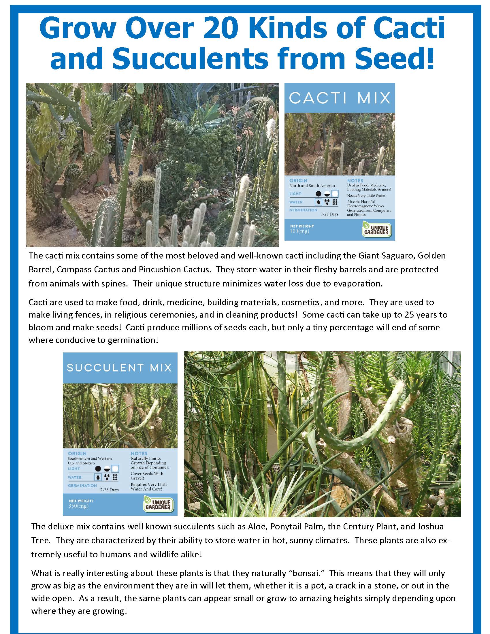 Cacti are actually subset of the larger Succulent grouping.  The deluxe mix contains well known succulents such as Aloe, Ponytail Palm, the Century Plant, and Joshua Tree.  They are characterized by their ability to store water in hot, sunny climates.  These plants are also extremely useful to humans and wildlife alike!