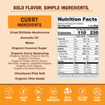 Ingredients: Dried Shiitake Mushrooms, Avocado Oil, Water, Organic Coconut Sugar, Organic Curry Seasoning (Organic Spices, Organic Garlic, Organic Turmeric, Organic Freeze-dried Lemon, Sea Salt, Organic Jalapeño Pepper, Organic Chili Pepper, Organic Smoked Paprika), Himalayan Pink Salt, Organic Chia Seeds.