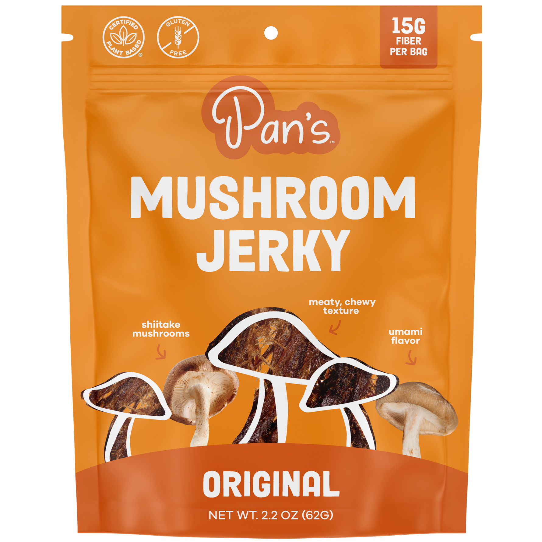 Made of shiitake mushrooms, Pan's Original Mushroom Jerky is plant-based, vegan, a good source of fiber, allergen friendly, Kosher, soy-free, gluten-free and made with simple ingredients.