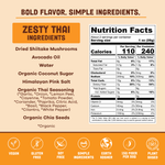 Ingredients: Dried Shiitake Mushrooms, Avocado Oil, Water, Organic Coconut Sugar, Himalayan Pink Salt, Organic Thai Seasoning (*Garlic, *Onion, *Lemon Peel, *Cayenne, *Tomato Powder, *Coriander, *Paprika, Citric Acid, *Basil, *Black Pepper, *Cilantro, *White Pepper), Organic Chia Seeds. *Organic.