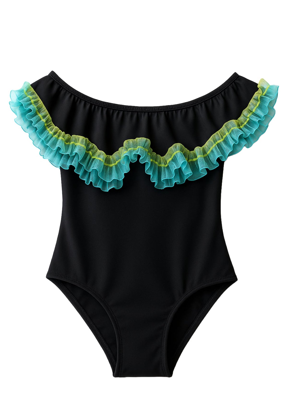 Classic and cool black bathing suit for girls in best selling cut made from buttery soft high quality fabric with anemone fringe. This bathing suit can be worn on or off shoulder. See matching beach cover-up ponchos and beach cover-up pants combined with beach accessories  including the many friendship bracelets and colorful swimming goggles.