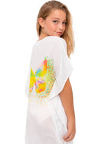 Easy to wear cover up poncho for the beach with happy colorful butterfly print and matching accessories for a complete Stella Cove beachwear look. Looks great with the neon pink swimming goggles.