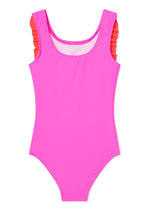 Neon pink and red side ruffle bathing suit for girls with matching accessories and cover ups for a complete Stella Cove beachwear look. Looking for pink swimwear for girls ? Look no further and make sure to check out the colorful swimming goggles to match as well as friendship bracelets for girls and beach cover-ups for girls.