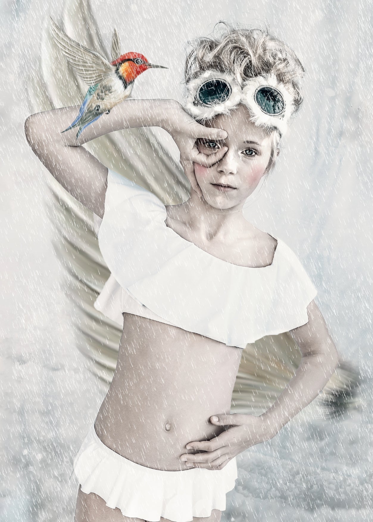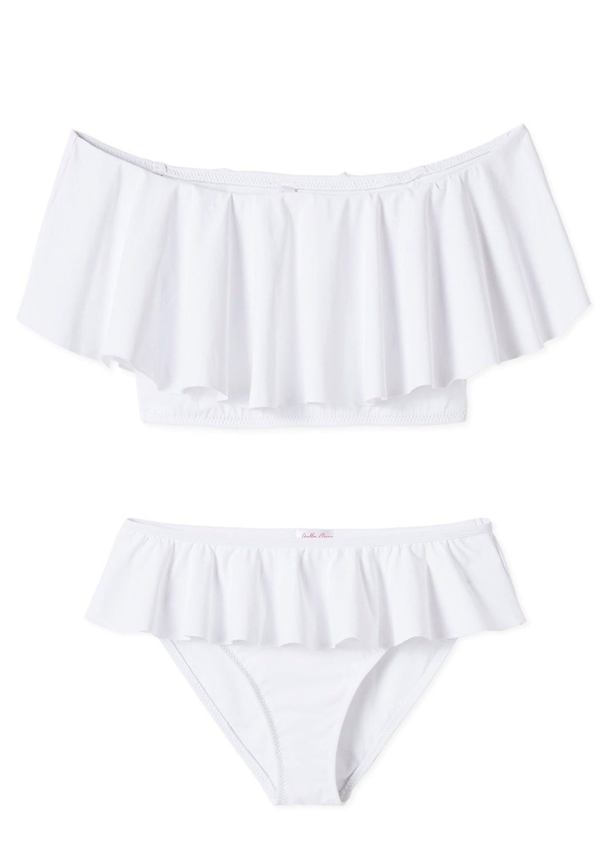 Ruffled white bikini for girls in a best selling cut made from high quality fabrics can be worn off or on the shoulders with matching swimsuits and cover ups for girls.  This bikini for girls looks beautiful with the Stella Cove beach cover-ups for girls as well as the many beach accessories including cute swimming goggles for girls.