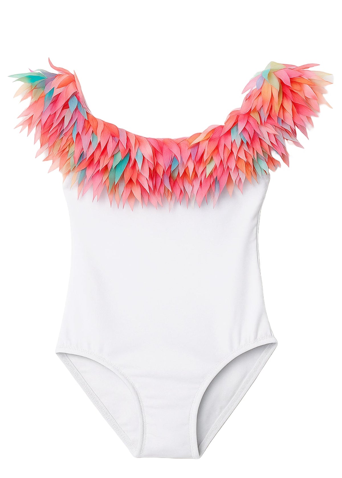 Perfect  swimsuit for girls in optic white in best selling cut with sugar skies petals which can be worn off or on shoulder with matching accessories and cover ups for a complete Stella Cove beachwear look which makes a cute match with the rainbow sunglasses.