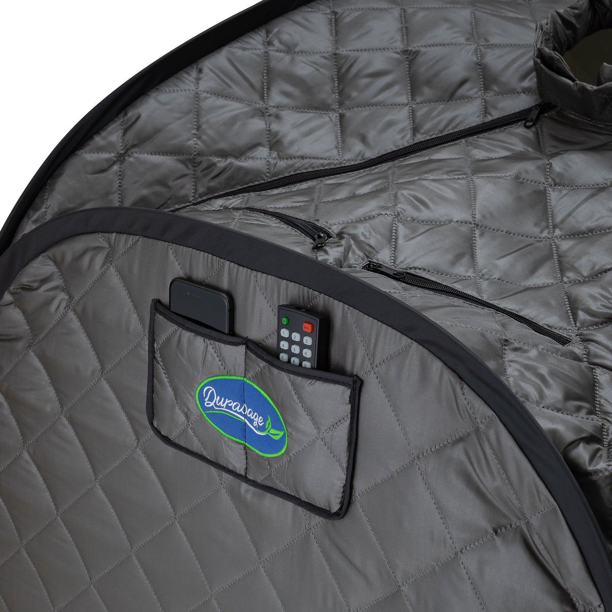 • FRONT POCKET: Allows you to keep your necessities near by and easy to access while inside the sauna
