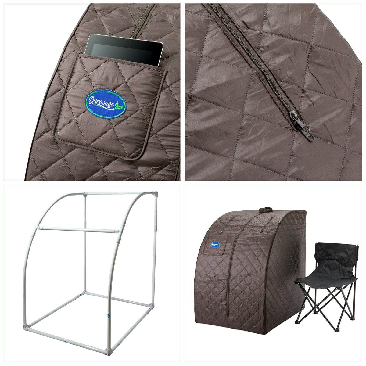 • Contents: 600D Polyester Sauna Cover, PVC Frame Tubes, Steam Generator w/ Hose, Foldable Chair with Bag, User Manual