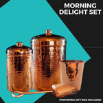 Add some copper shine to your morning's delight. A quart sized copper canister for your favorite coffee or tea, another 2 cup canister for your sugar, a small scoop for dolling out both, a limited run creamer copita with spout and a sweet sounding summoning bell to wake the weary for their morning delight.