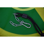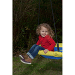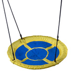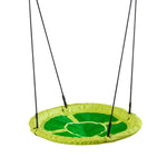 These brightly colored two-tone circular saucer swings from Creative Cedar Designs are featured in your choice of Sunshine Yellow and Ocean Blue, or Lime Green and Grass Green. Hang the ropes either side by side on swing hangers, or hang both ropes on one swing hanger in the center for more of a spin (this product does NOT rotate 360 degrees.) This circular saucer swing stands out from the competition through the bright bold colors and super high quality materials we used to create it. Holds up to 400 lbs. Either pile up some kids for a wild ride, or take a more leisurely ride yourself, this sturdy swing will easily support you and your family with no worries about safety. Made from UV tested material so that your swing stays bright and colorful through the elements. Strong steel frame is padded for comfort, to ensure comfortable swinging for hours. One-year warranty against manufacturer’s defects.