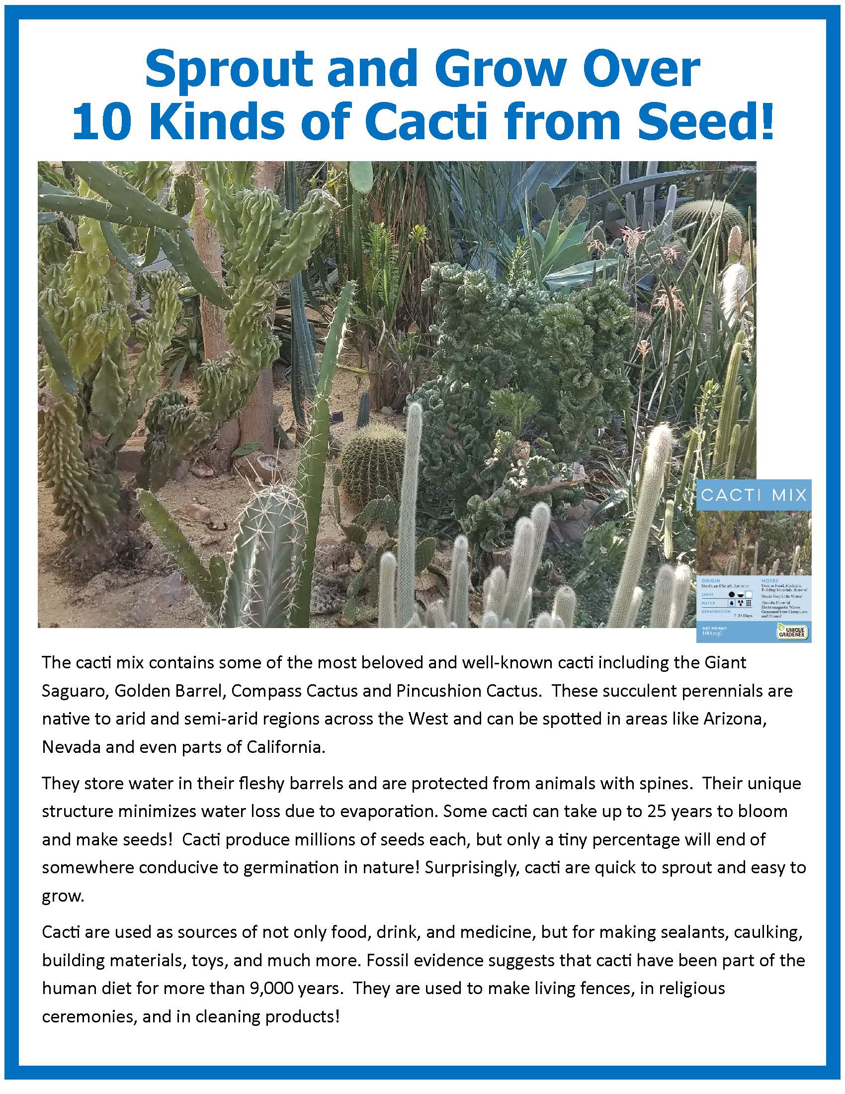 The cacti mix contains some of the most beloved and well-known cacti including the Giant Saguaro, Golden Barrel, Compass Cactus and Pincushion Cactus. They store water in their fleshy barrels and are protected from animals with spines.Their unique structure minimizes water loss due to evaporation.