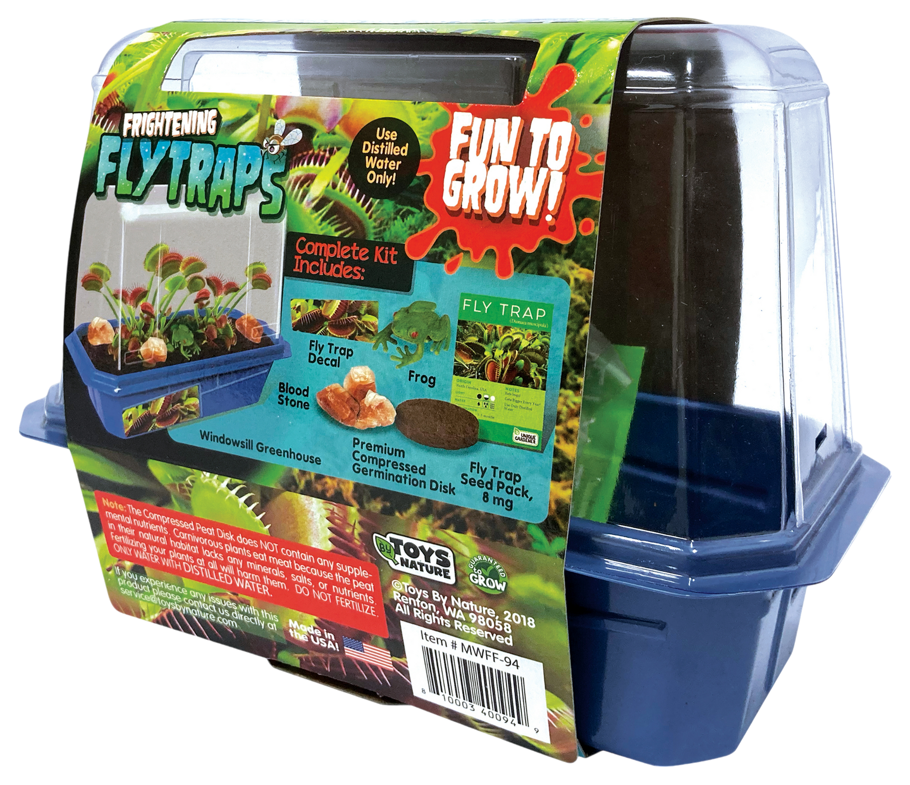 Grow your own collection of feared and famous meat-eating plants.  This kit features the infamous Venus Fly Trap. Watch these fascinating plants grow from harmless seeds into vicious bug-eating monsters!  The leaves of a Venus Fly Trap are covered with fine hairs.  When an insect lands on the plant, the pressure on these hairs causes the jaw-like foliage to snap closed, trapping the insect inside. Make your own authentic bog with the included peat planting mix, Blood Rocks (genuine collectable Red Calcite) and competitive fun frog!  With proper care, this rare and unusual collection of carnivorous Fly Traps will flourish for years in the specifically designed terrarium.