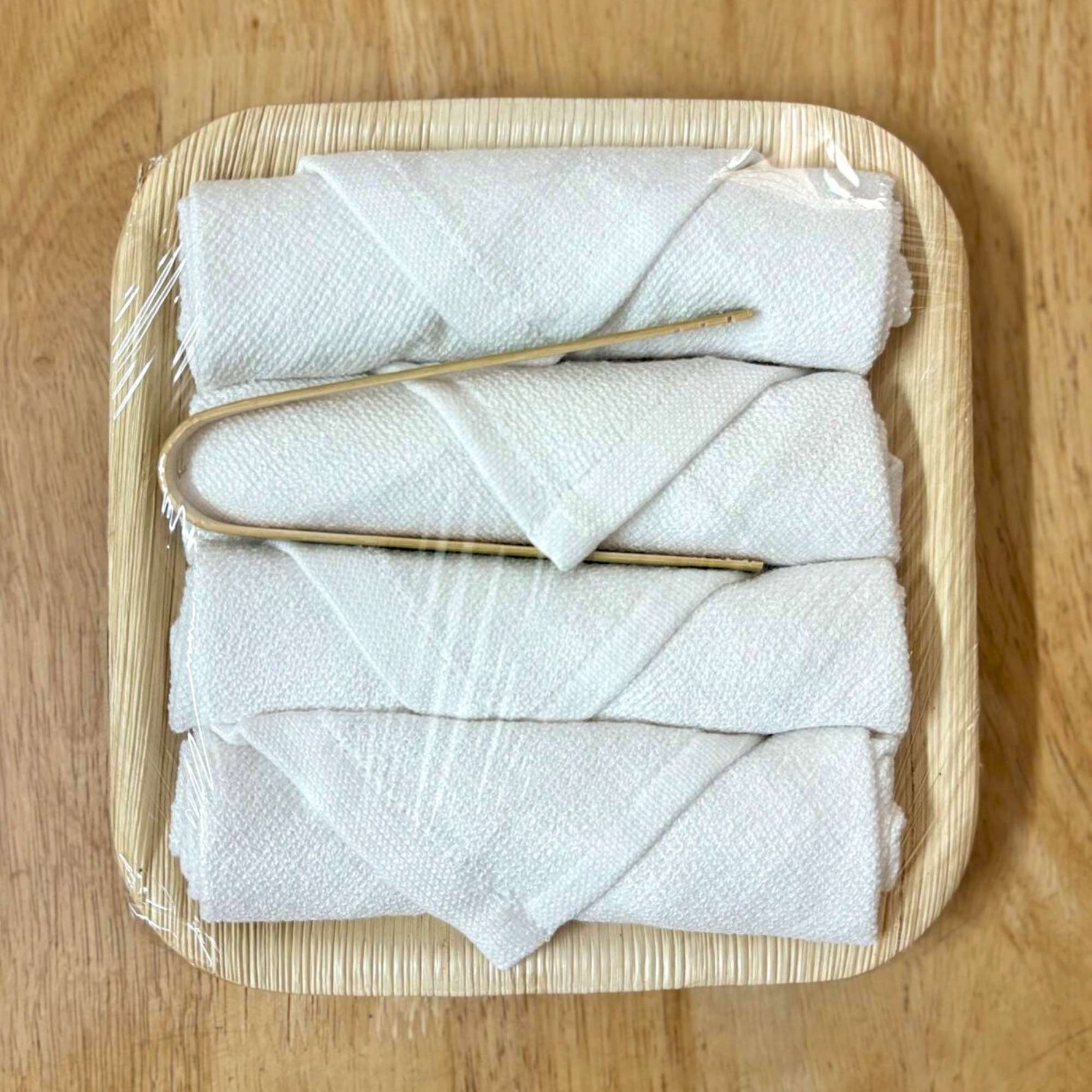 Includes: set of 4 10x10 White Washcloths made from 60% Bamboo/40% Cotton, 1 Areca Palm Leaf tray and 1 pair of Bamboo tongs. 400GSM