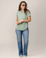 The staple nursing tee you need for spring and summer! This super-soft, breastfeeding-friendly shirt has a relaxed drape and discreet nursing panel - ideal for feeding on the go. For breastfeeding access, lift up the asymmetrical nursing panel and pull aside the inner V-neck layer. With a modern fit, flattering crew neckline, and decorative cuffs, this short-sleeve nursing shirt pairs perfectly with jeans, joggers, or leggings.