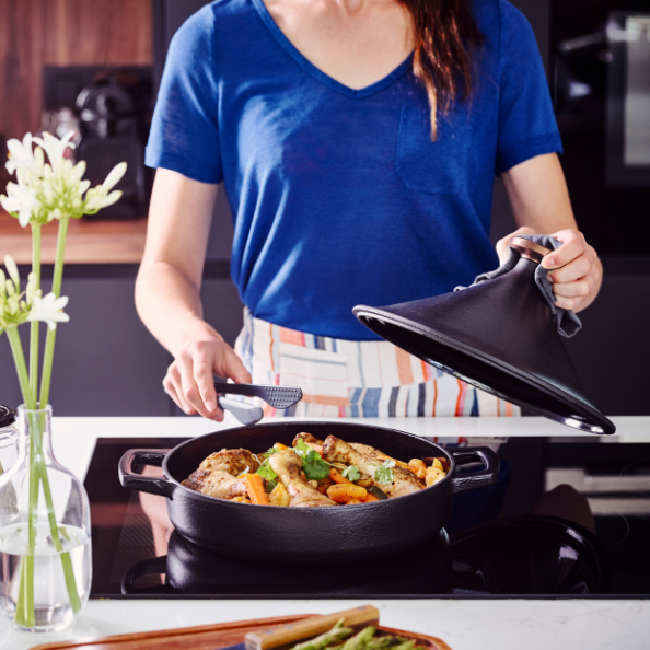 The conical lid creates ideal steam circulation that continuously bastes your food. Unlike ceramic tagines that crack under temperature changes, our cast iron design maintains perfect moisture balance for hours of slow cooking.