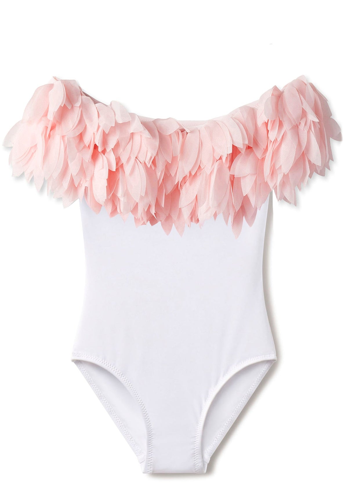 Best selling bathing suit for girls with ruffle and unique pink chiffon petal trim which can be worn on or off the shoulders. This white swimsuit for girls look beautiful with the many beach cover-ups, hats and beach accessories including swimming goggles and friendship bracelets for girls in the Stella Cove collection for girls.