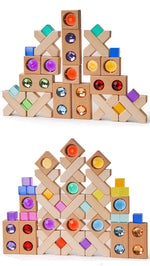 The 80 pieces combination set comes with 32 x-shape blocks and 48 colored lucite cubes. It comes with a wood storage tray that makes clearing away after playtime. This large set will provide cute and unique gifts for birthdays, Christmas, and other occasions.