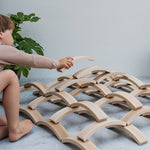 A set comes with 12 pieces. Each block is handcrafted and made with beech wood. These natural wooden arches can be used to stimulate fine motor skills, concentration, perseverance, creativity, and imagination.