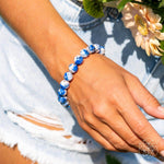 Striking bursts of Azurite blue sweep across the majestic white-gray Granite matrix. Each bead is its own little world—symbolizing a perfect balance of natural earthly strength and limitless potential.